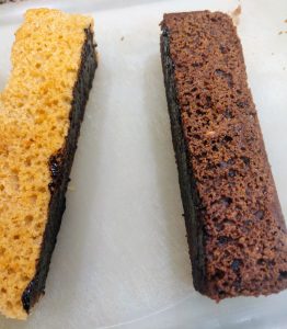 - Divide both the cakes, vertically, so that you have 4 log-shaped cakes, 2 of vanilla and 2 of chocolate.